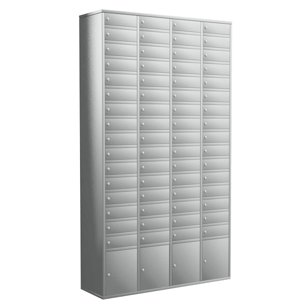 - Абонентский шкаф на 64 «глухих» ячейки под формат А4 без прорезей под корреспонденцию и сервисной двери.
