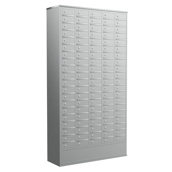 - Абонентский шкаф на 100 «глухих» ячеек под формат А5 без прорезей под корреспонденцию и без сервисной двери.