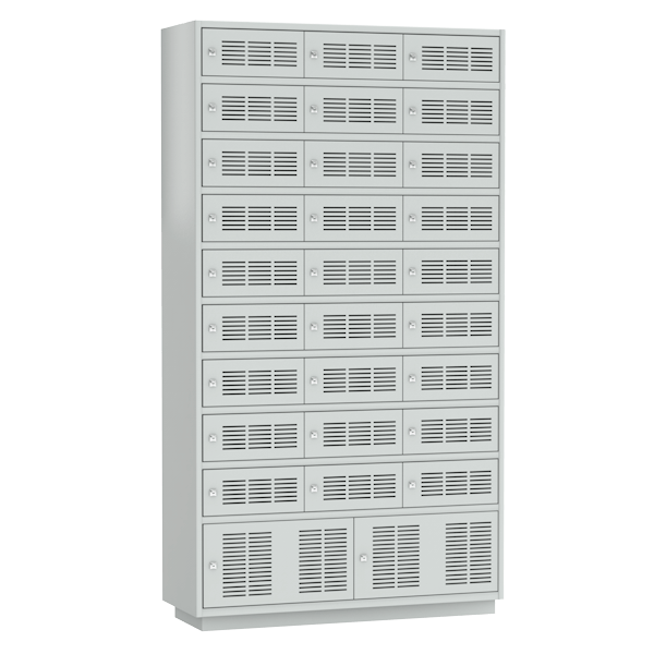 - 27 запираемых ячеек с габаритами (ВхШхГ) в мм: 155х360х370, в верхней части шкафа, 9 рядов по 3 ячейки.