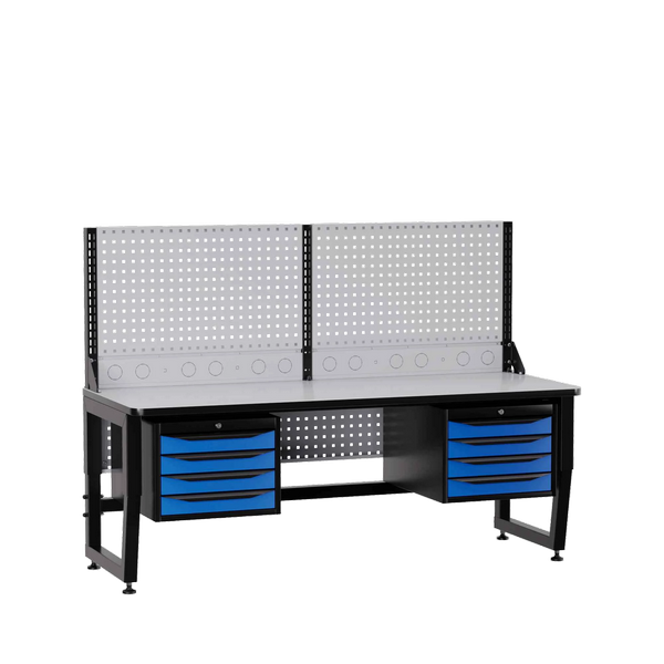 - Укомплектован двумя подвесными тумбами, перфорированными экранами и панелью коммуникаций.