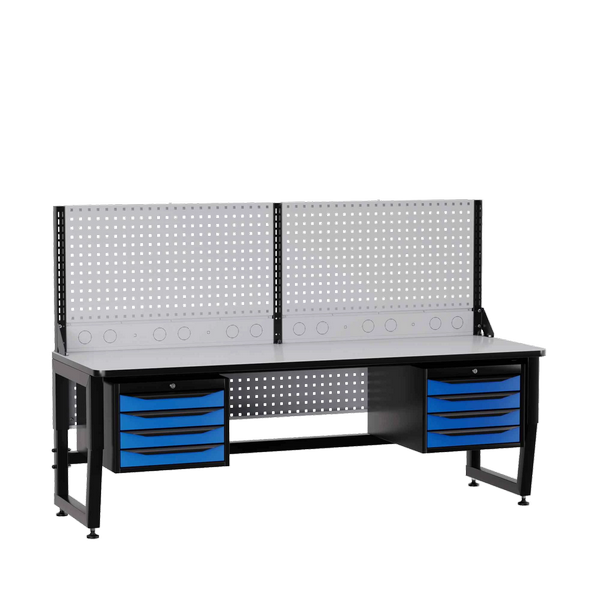 - Укомплектован двумя подвесными тумбами, перфорированными экранами и панелью коммуникаций.