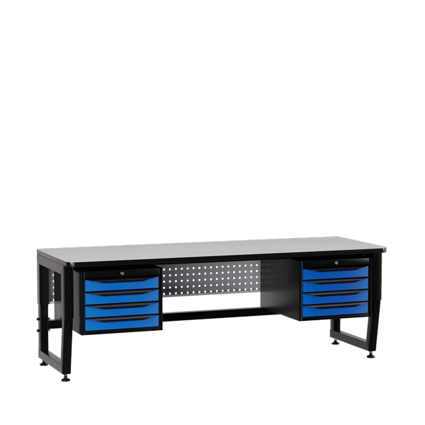 - Оборудован двумя тумбами с четырьмя выдвижными ящиками в каждой.