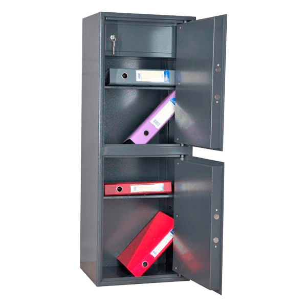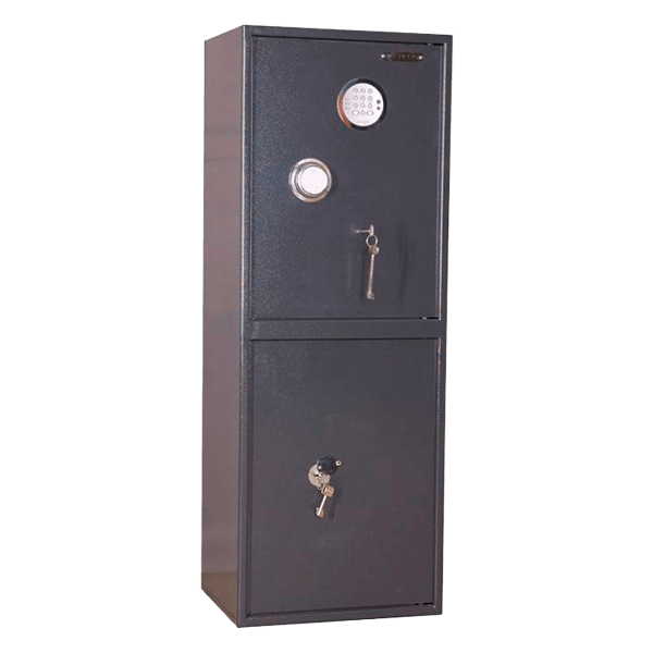 - В шкафу предусмотрено две полки съемного типа и трейзер для хранения наличных.