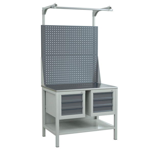 - Оснащается оцинкованной столешницей, одинарным либо двойным перфорированным экраном с консолями и двумя подвесными тумбами с тремя выдвижными ящиками каждая.