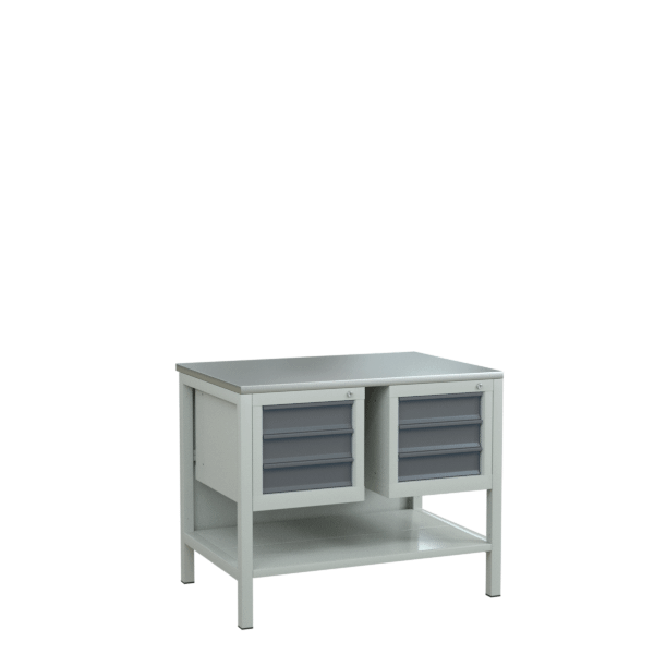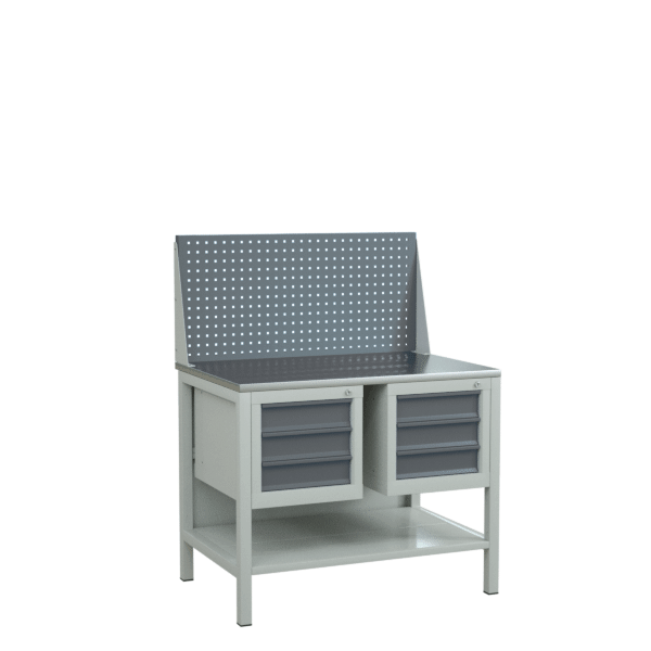 - Верстак 1000 с полкой и двумя подвесными тумбами, каждая тумба оснащена тремя выдвижными ящиками — надёжное рабочее место для мастерских, производственных зон, сервисов, гаражей, а также для хобби-мастеров. Каркас выполнен из прочного стального профиля, выдерживает нагрузку до 500 кг на столешницу, что позволяет использовать тяжёлое оборудование и инструменты без риска деформации.