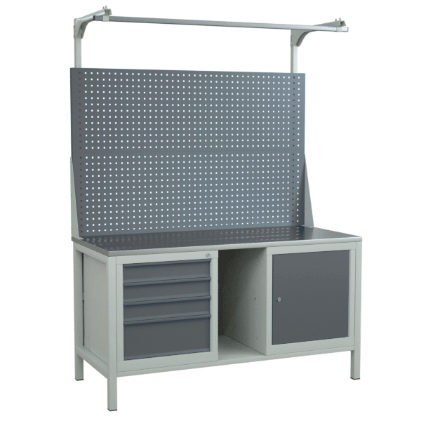 - Комплектуется перфорированным двойным экраном, тумбой с 4 выдвижными ящиками (нагрузка на ящик – до 30 кг) и тумбой с распашной дверцей и одной полкой.