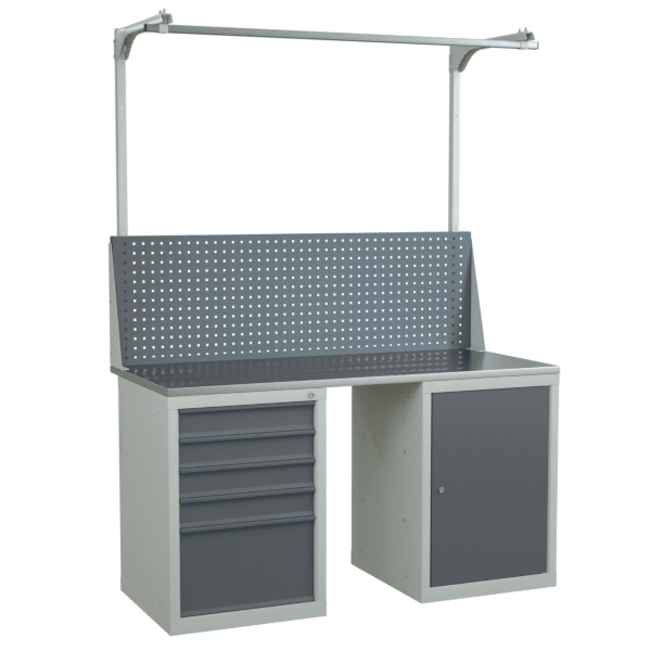 - Цвет корпусов верстака и тумбы – серый (RAL 7038), цвет дверец, ящиков и экрана – серый (RAL 7016).