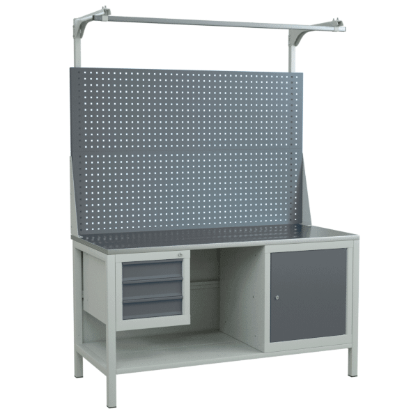 - Корпусы верстака и тумб, консоли и перекладина-направляющая выполнены в сером цвете (RAL 5012).