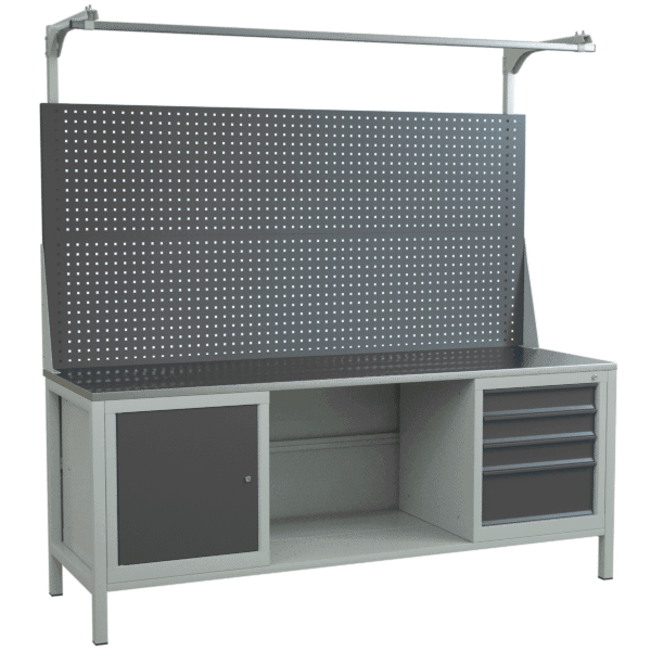 - Стол верстак для производства двухтумбовый оснащён оцинкованной столешницей, двумя тумбами и одинарным перфорированным экраном с консолями.