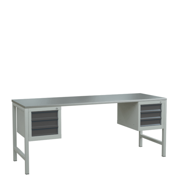 - Оснащён оцинкованной столешницей и двумя подвесными тумбами с тремя выдвижными ящиками.