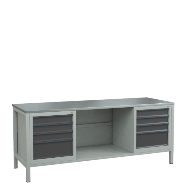 - Оснащён оцинкованной столешницей и двумя тумбами с 4 выдвижными ящиками.