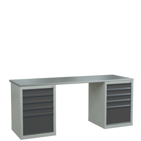 - Оснащён с оцинкованной столешницей и двумя тумбами с 5 выдвижными ящиками каждая.
