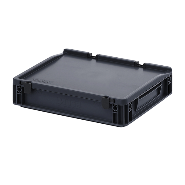 - Комплект поставки включает: контейнер — 1 шт., крышку на шарнирах — 1 шт., два шарнира и два запирающих рычага.