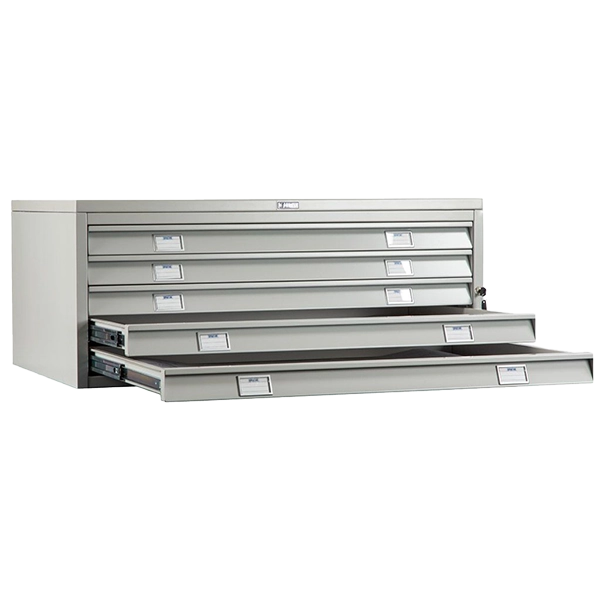 - Предусмотрена возможность установки разделителей для хранения документов форматов A2, A3 и A4 (опция), а также монтаж промежуточной секции из 5 ящиков, что позволяет увеличить общую вместимость модуля до 15 ящиков.