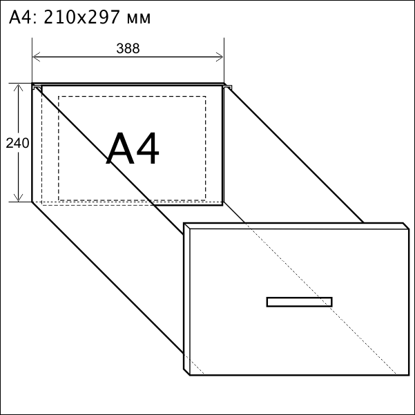 - Предназначен для хранения документов формата Foolscap/A4 (210 x 297 мм) в подвесных файлах (каждый документ отдельно), либо в папках типа "Корона".