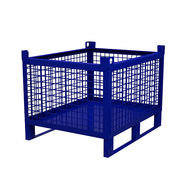 - Комплектуется опорными швеллерами, позволяющими устанавливать контейнер на ригели стеллажей и транспортироваться с помощью вилочных погрузчиков или гидравлических тележек.