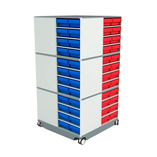 Комплектация Поворотное основание на 4 колесах, крышка, 12 кассет К-01/1, 48 пластиковых ящиков (красные), 48 пластиковых ящиков (синие)