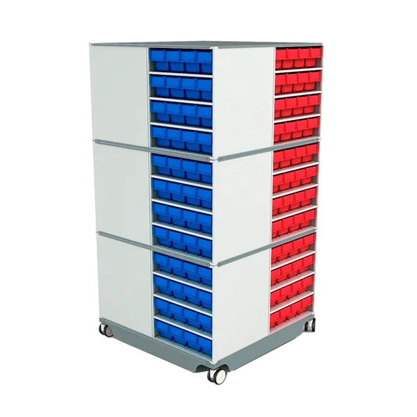 Поворотное основание на 4 колесах, крышка, 12 кассет К-01/2, 48 пластиковых ящиков (красные), 48 пластиковых ящиков (синие)