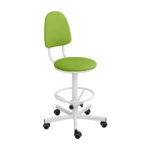 - Промышленный стул КР03/К (на колесах), обивка светло-зеленая, каркас белый идеально подходит для использования в лабораториях, производственных помещениях, офисах и других рабочих пространствах, где важны комфорт и долговечность.