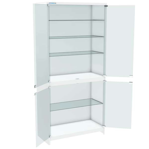 - У шкафа четыре стеклянные двери, что обеспечивает быстрый доступ к содержимому.