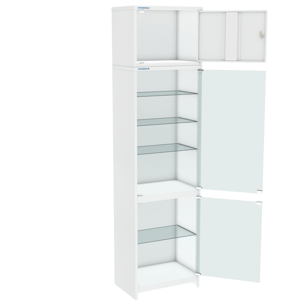 - Отделения оснащены стеклянными полками: одна в нижнем отделении, три в верхнем; фиксируются внутри шкафа.