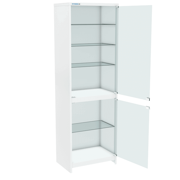 - Состоит из двух отделений со стеклянными дверцами, закрывающимися на магнитные защёлки.