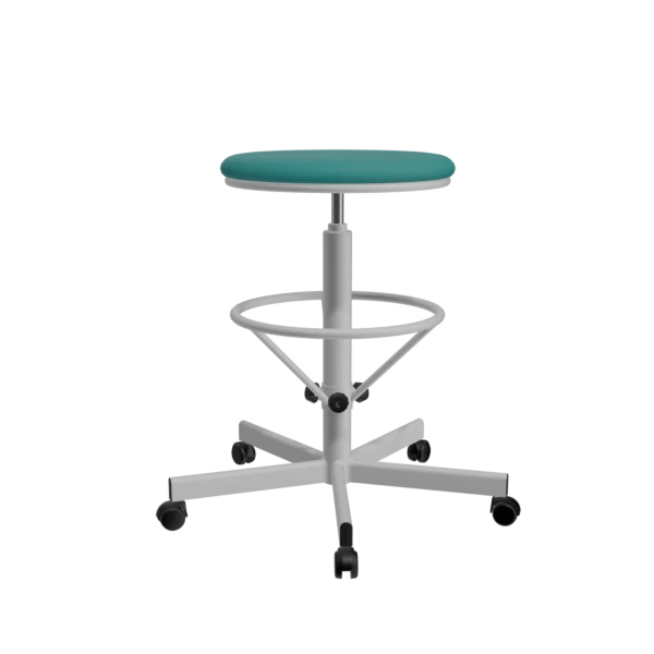 - Табурет на винтовой опоре с усиленной опорой для ног Т03/К (на колесах), обивка зеленая, каркас белый – надежное и удобное решение для медицинских кабинетов, лабораторий, салонов красоты и мастерских.