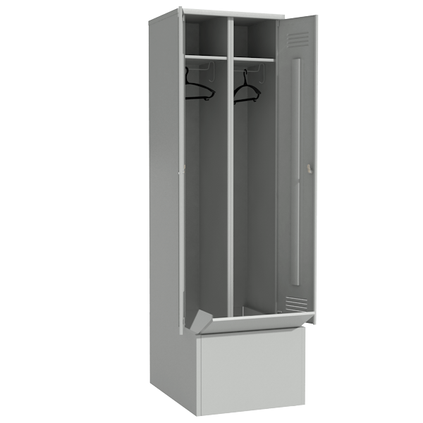 - Шкаф металлический, двухсекционный. Оборудован дополнительным отделением, предназначенным для хранения обуви. Шкаф используется для хранения сменной или верхней одежды, отделение - для хранения сменной или грязной обуви. Отделение под обувь выступает в качестве сидения.