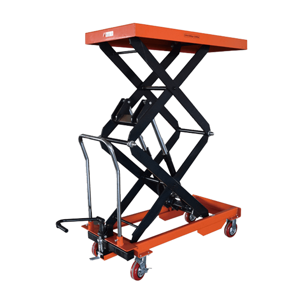 - Конструкция представляет собой платформу, закрепленную на механизме ножничного типа, с гидравлическим приводом с колёсами.