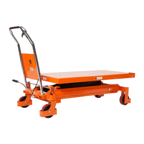 - Конструкция состоит из опорной рамы с колёсами, рабочей платформы и силовых диагональных тяг с ножничным механизмом.