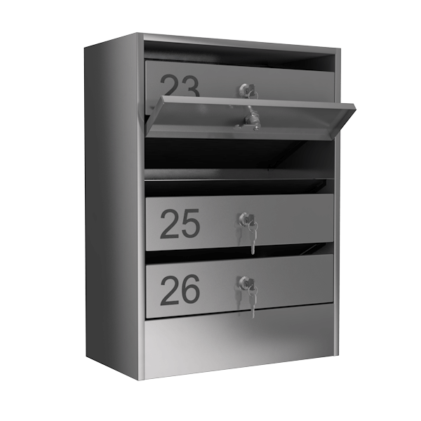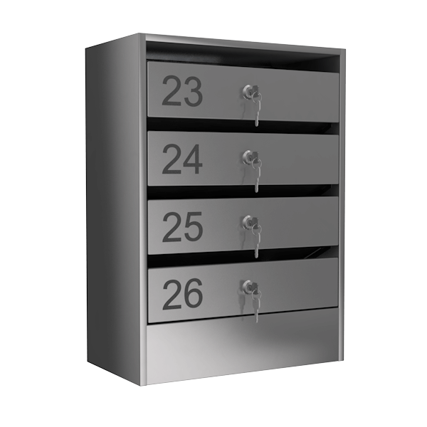 - Почтовый ящик из нержавеющей стали, состоит из 4 ячеек и рассчитан на 4 квартиры.