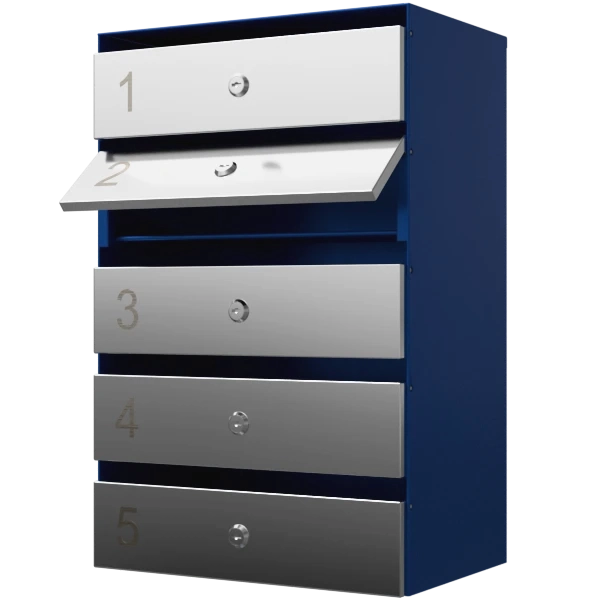 - Почтовый ящик состоит из 5 отдельных ячеек, каждая оснащена индивидуальным ключевым замком.