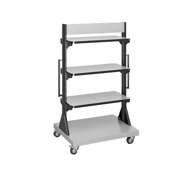 - Представляет собой платформу на колёсах, с размещенными на ней двумя стойками и закрепленными между ними полками и поперечной балкой.