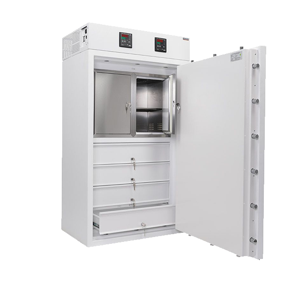 - Сейф оснащён четырьмя выдвижными, индивидуально освещаемыми и запираемыми 25-ти литровыми ящиками без обеспечения тепловых режимов хранения.