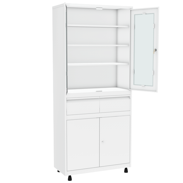 - В нижней части расположены два выдвижных ящика на телескопических направляющих, две двери с ключевым замком и металлическая полка.