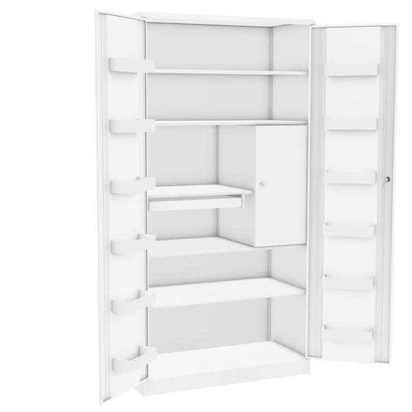 - Имеет две запираемые на ключ металлические дверцы. Это связано с тем, что некоторые медикаменты, хранимые в нем, могут быть сильнодействующими веществами, дозировка которых должна быть ограничена врачом, наркотическими или психотропными.