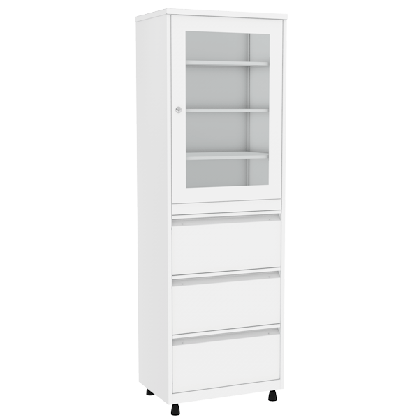 - В верхней части шкафа находится стеклянная дверь в металлической окантовке, за дверью находятся 3 металлические полки.