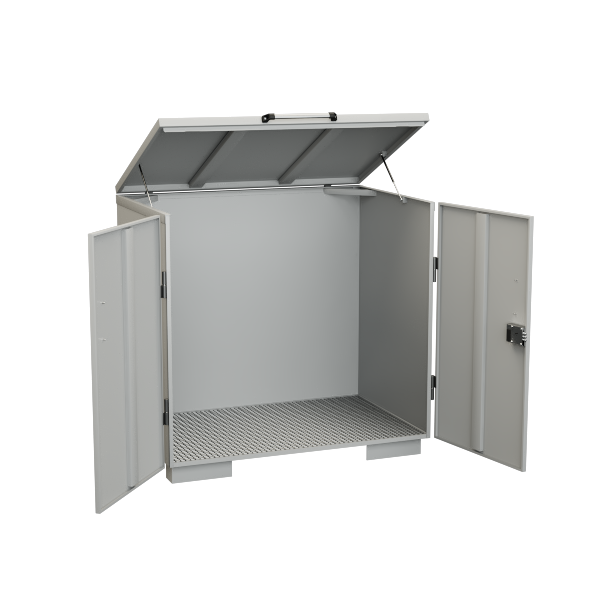 - Предназначено для хранения снаружи и внутри помещений двух 200-литровых бочек с горючими либо загрязняющими воду жидкостями.