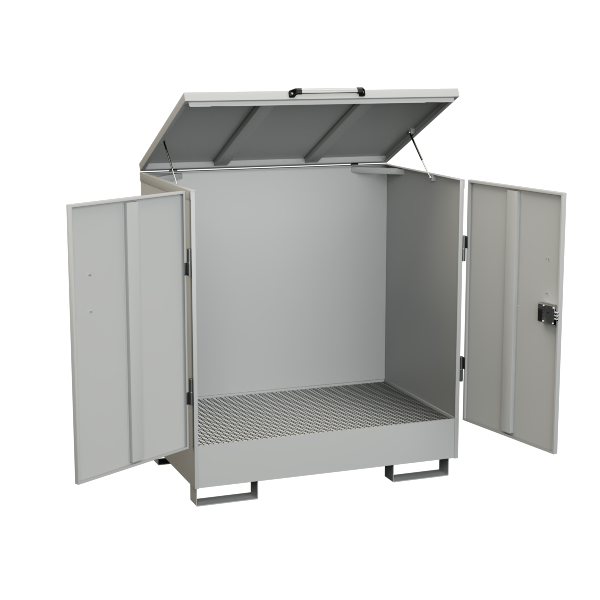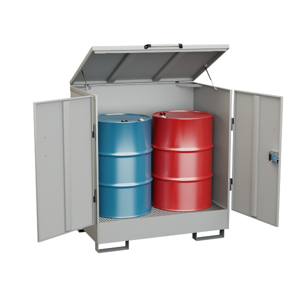 - Используется для размещения двух бочек объёмом 200 литров или других ёмкостей с горючими либо загрязняющими воду жидкостями.