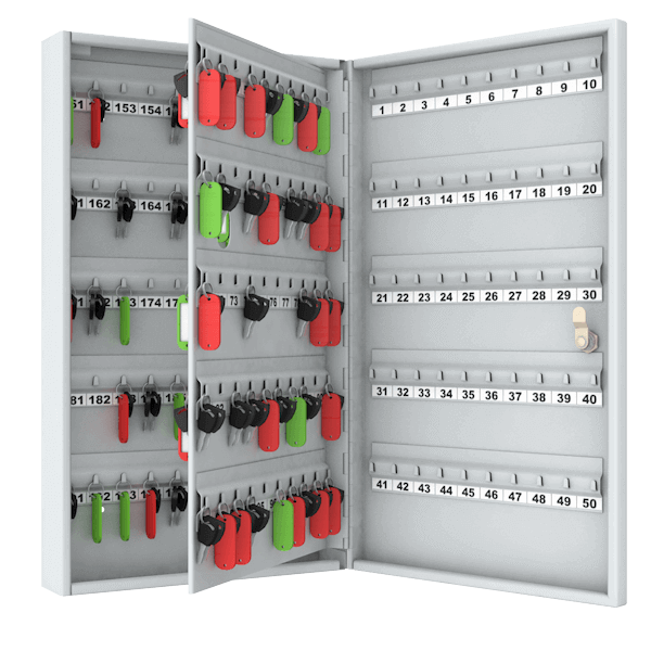 - В шкафу расположены 20 металлических планок с крючками для размещения ключей.