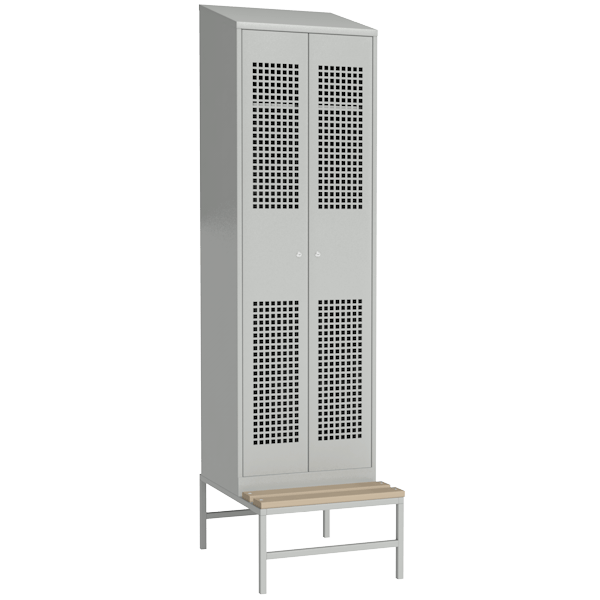 Шкаф с перфорированными дверьми с наклонной крышей на подставке со скамьей