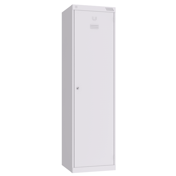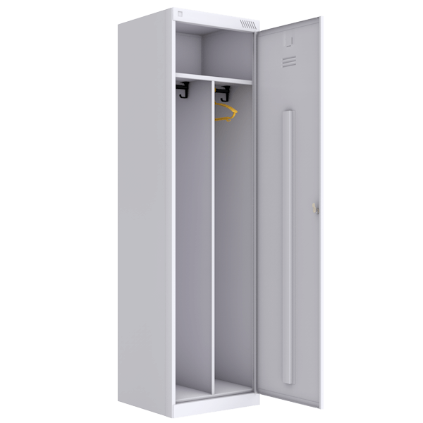 - Односекционный, однодверный металлический шкаф с двумя отделениями, разделенными стальной перегородкой.