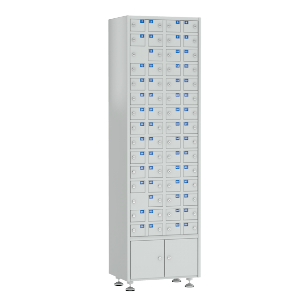 - Шкаф включает в себя 60 ячеек с индивидуальным номером. В ячейки встроены замки типа «Cam Lock». В комплекте поставляются бирки для ключа. Шкаф укомплектован регулировочными резьбовыми ножками.