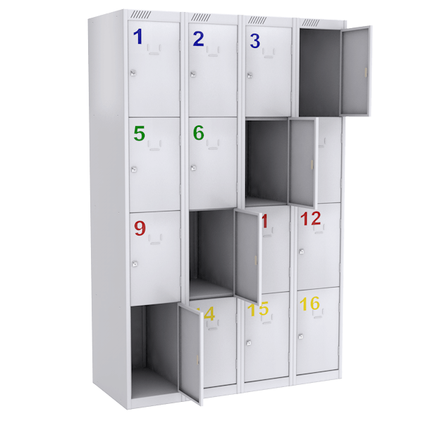 - Шестнадцать металлических дверок. На дверцах расположены держатели для карточки или номерка.