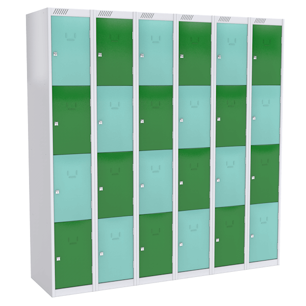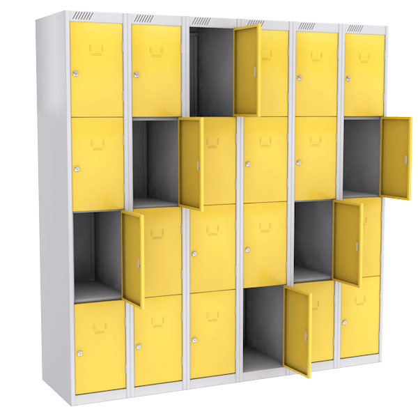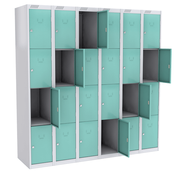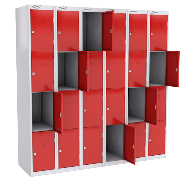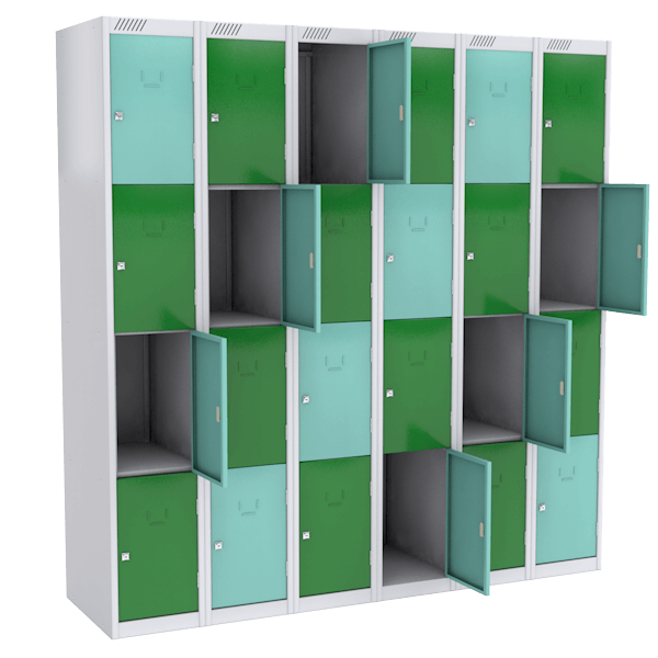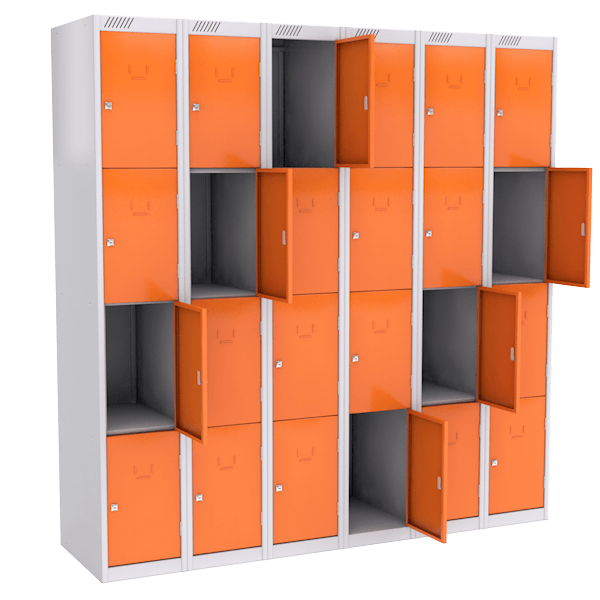 - 24 металлических дверцы. На дверцах расположены держатели для карточки или номерка.