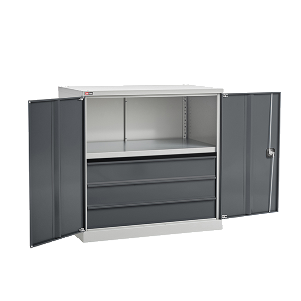 Шкаф комплектуется металлической полкой и тремя выдвижными ящиками