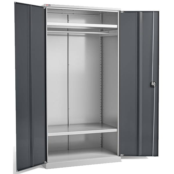 - Комплектуется двумя полками из оцинкованной стали и гардеробным комплектом.