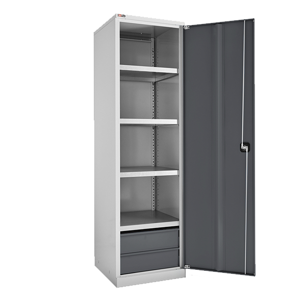 - Комплектуется четырьмя полками из оцинкованной стали, двумя выдвижными ящиками на телескопических направляющих.
