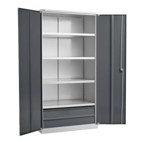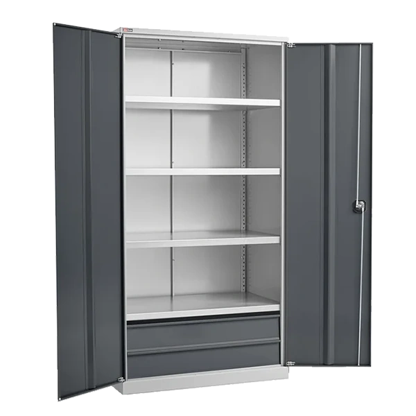 - Шкаф укомплектован четырьмя оцинкованными полками с возможностью регулировки по высоте с шагом 50 мм, а также двумя выдвижными ящиками на телескопических направляющих с полным выдвижением.