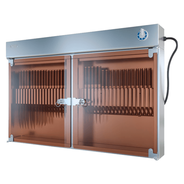 - Обеззараживание ножей или других приборов происходит при помощи ультрафиолетового излучения в диапазоне длин волн 205-315 нм.